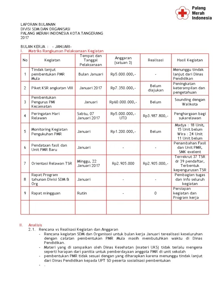 Laporan pertanggung jawaban pmr (palang merah remaja) smkn 5 kota bekasi jl. Bab ii program kegiatan ekstrakurikuler palang merah remaja ( pmr ) sma. Membuat laporan keuangan (bulanan), serta melaporkan pada ketua dan pembina pmr. Dan misi awal diadakan acara ekstrakulikuler dapat tersampaikan dan sukses adanya. Kegiatan extrakurikuler pmr ( palang merah remaja ) adalah merupakan salah satu upaya untuk mengarahkan siswa dalam pembinaan diri agar memiliki .