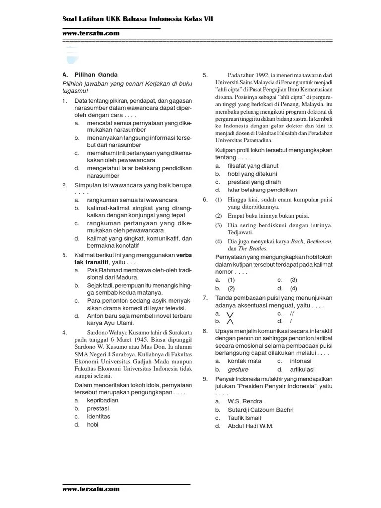 Download bank contoh soal bahasa indonesia kelas 7 (tujuh) kurikulum 2013 semester 1 dan 2 beserta kunci jawaban dan pembahasannya.